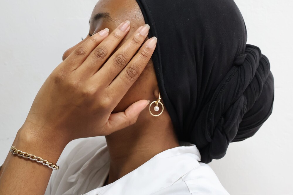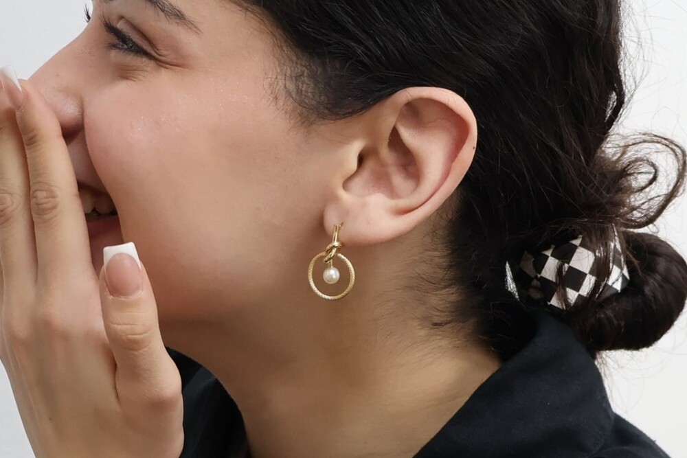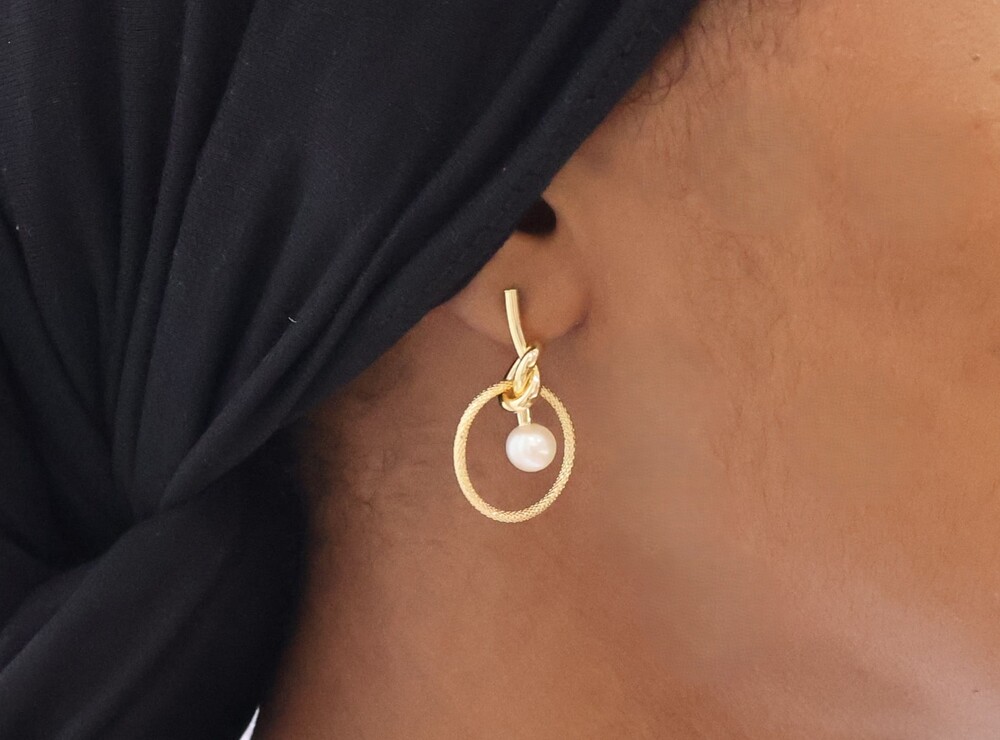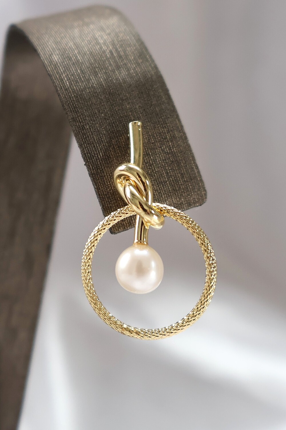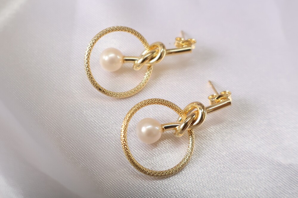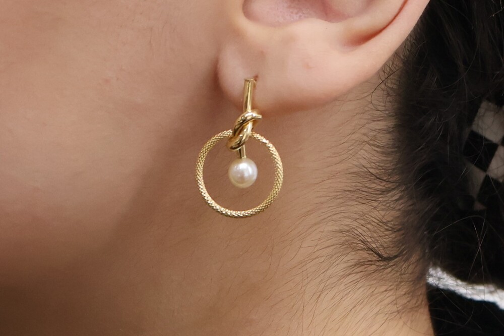14K 골드의 원형 프레임에 진주가 물방울처럼 표현된