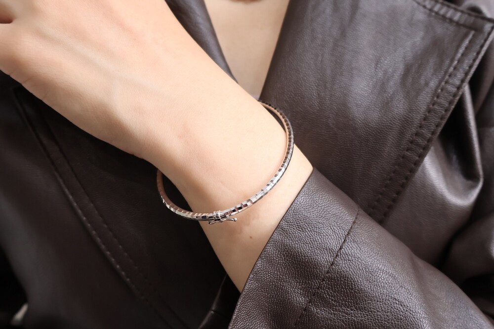 커브 체인은 납작하게 눌린 듯한 유닛들이 부드럽게 연결되어 있어 손목에 자연스럽게 감기며, 편안한 착용감을 제공합니다. 특히, 커브 체인 하나하나에 정밀한 다이아 컷팅을 더해 빛을 받을 때마다 보석처럼 섬세하게 반짝이는 효과를 연출합니다.