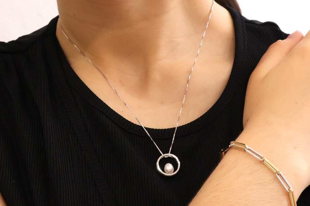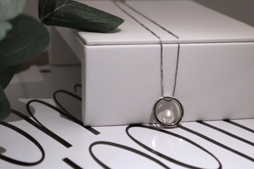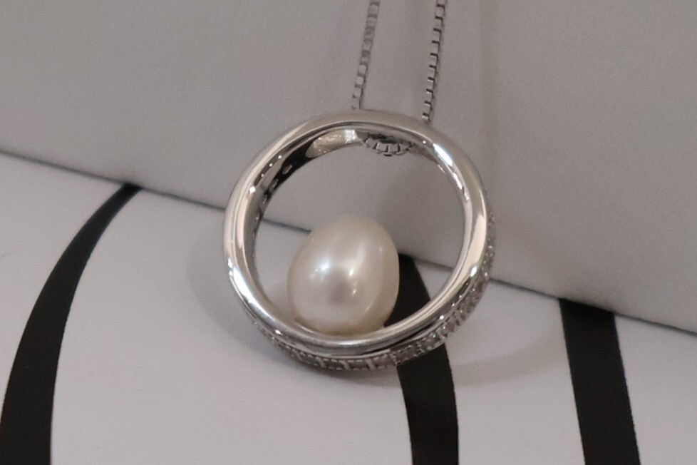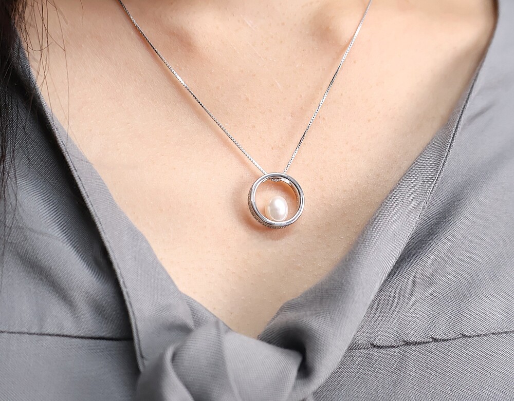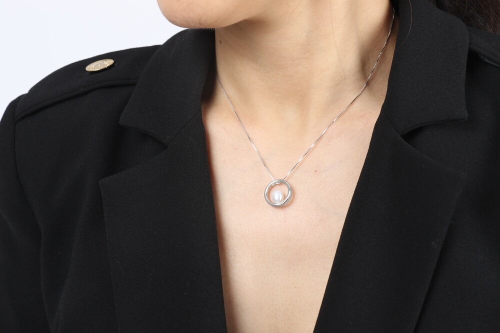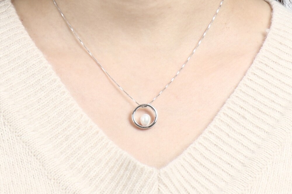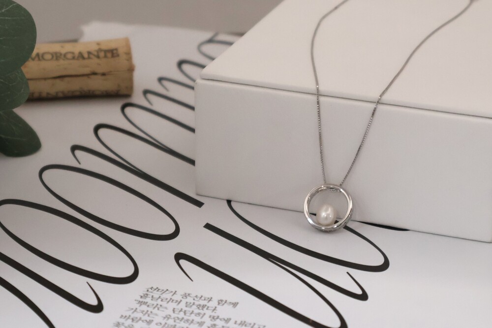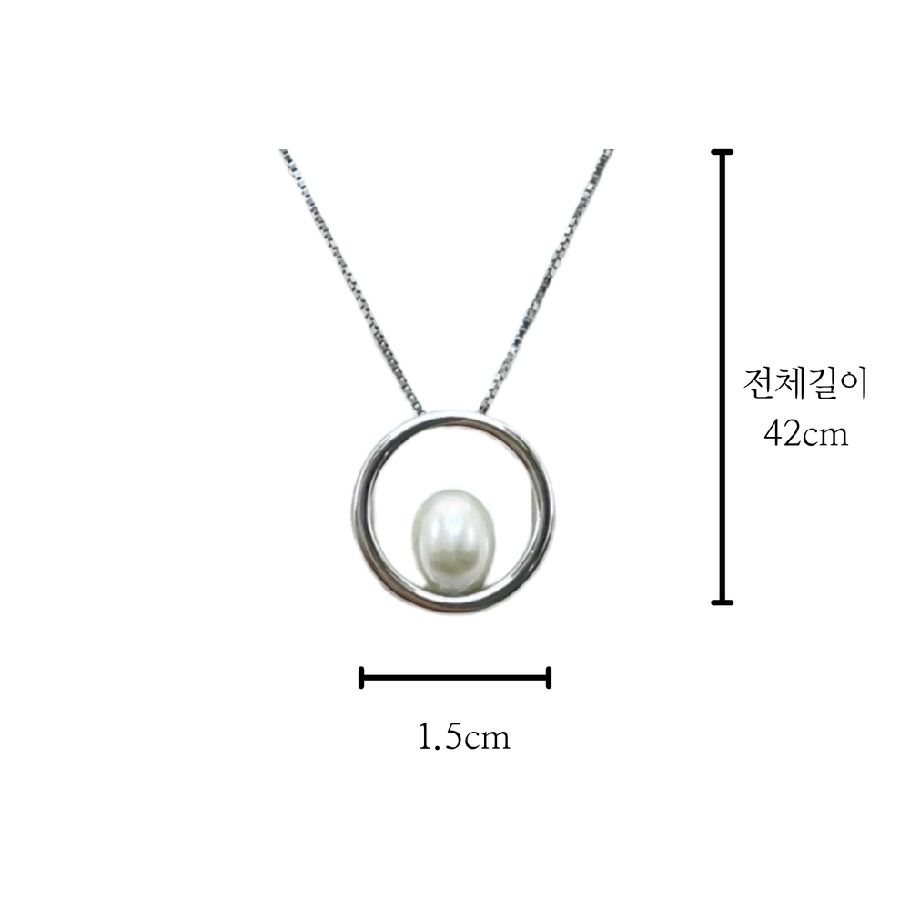 실버 라운드 프레임 안에 담긴 진주가 고급스럽고 우아한 무드를 연출해주는 디자인입니다.