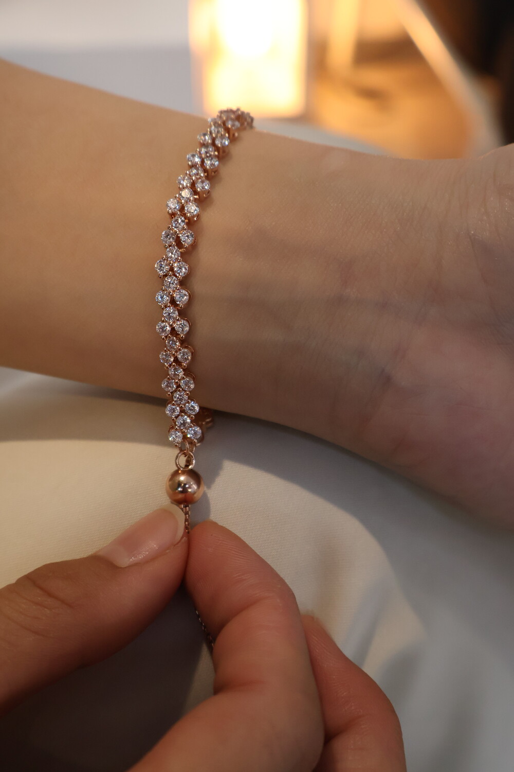로즈골드 컬러 위에 이태리 CZ가 세팅되어 섬세하면서도 화사한 빛이 돋보이는 팔찌입니다.