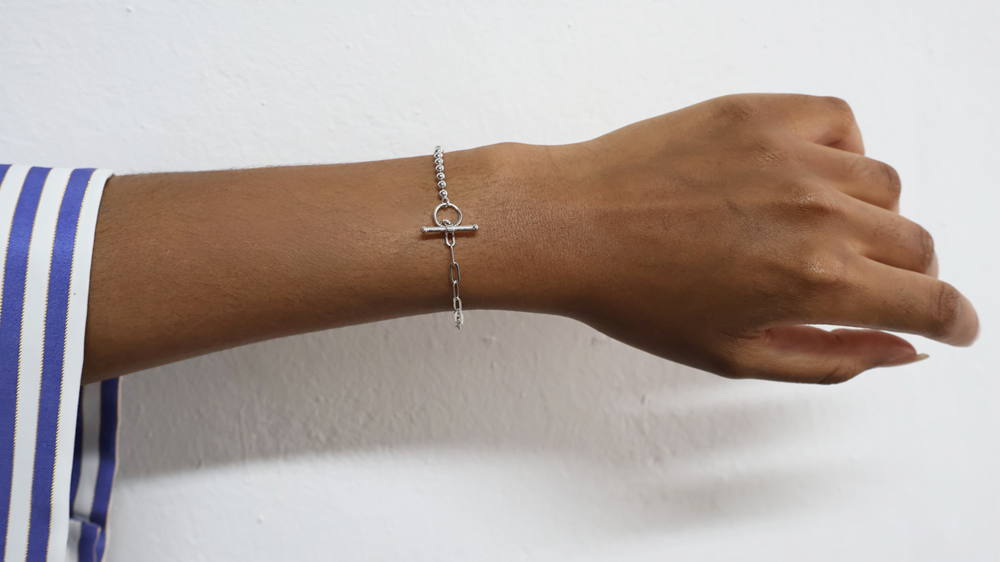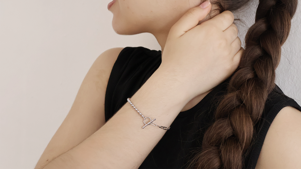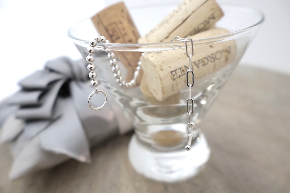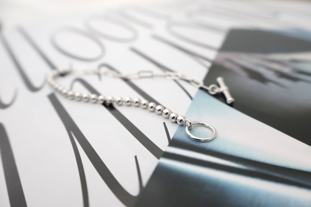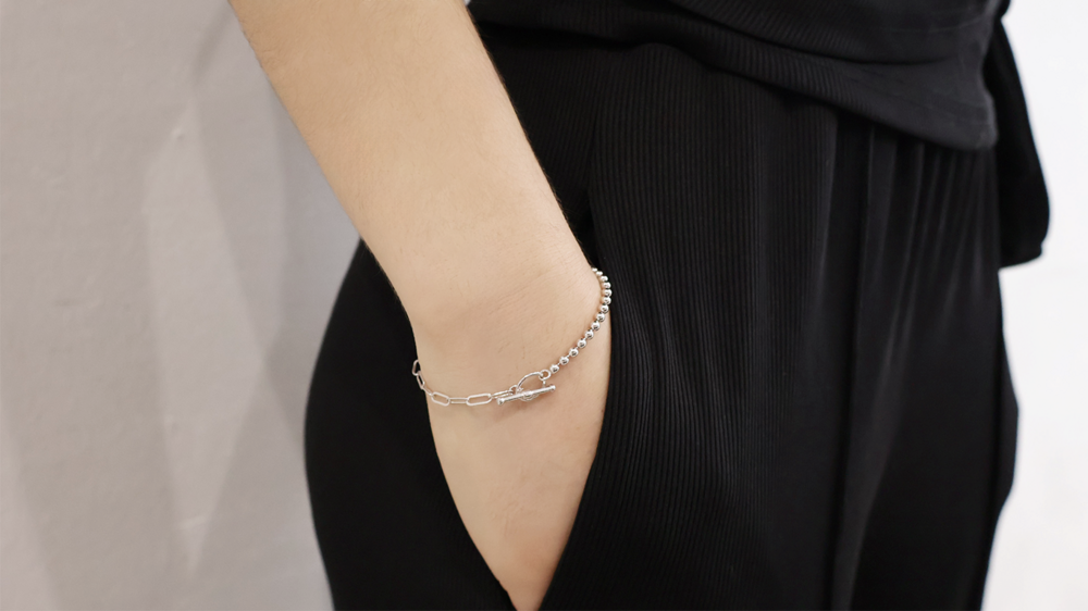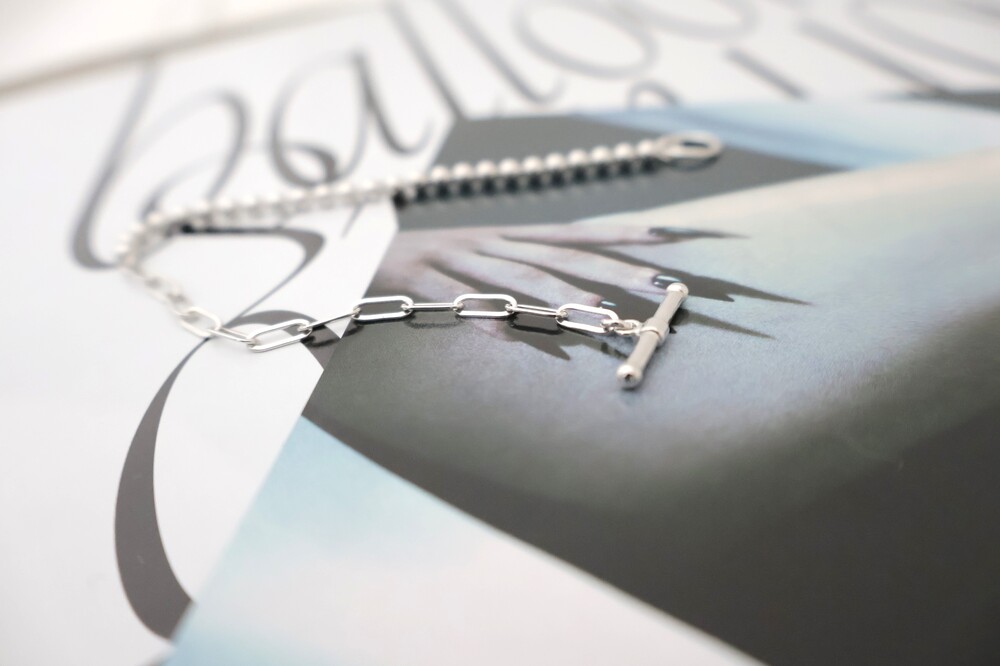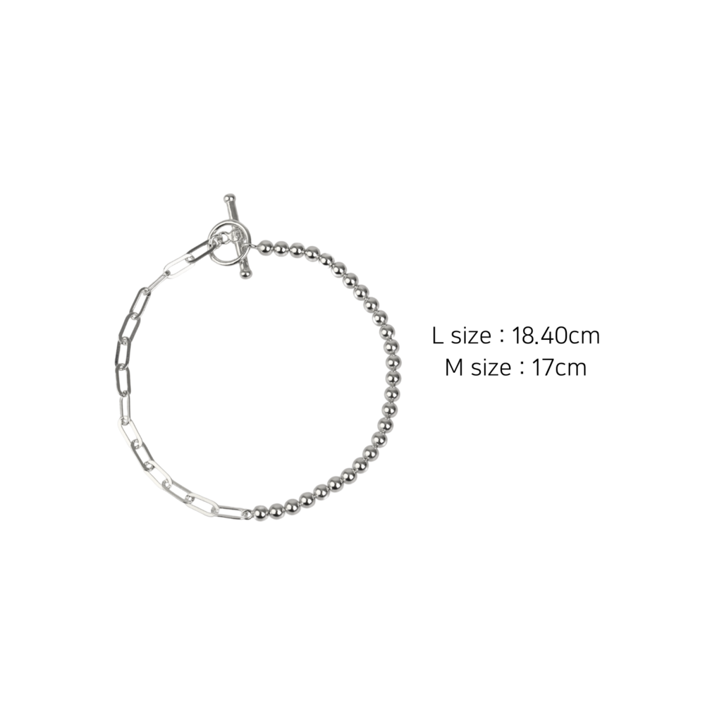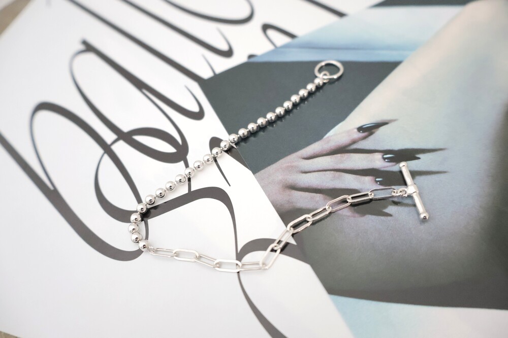 반은 미니멀한 구슬, 반은 유니크한 체인으로 구성된 스타일로 부담스럽지 않게 착용가능합니다.