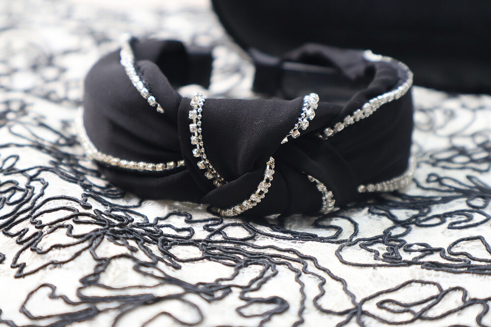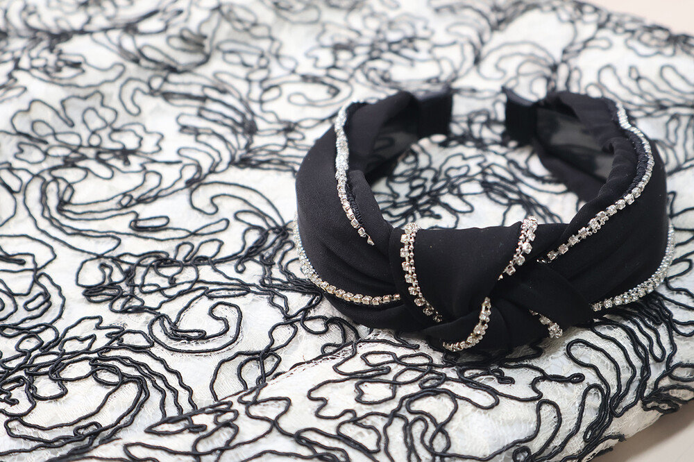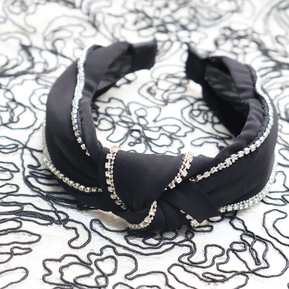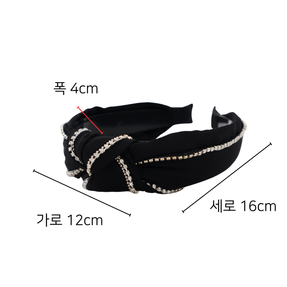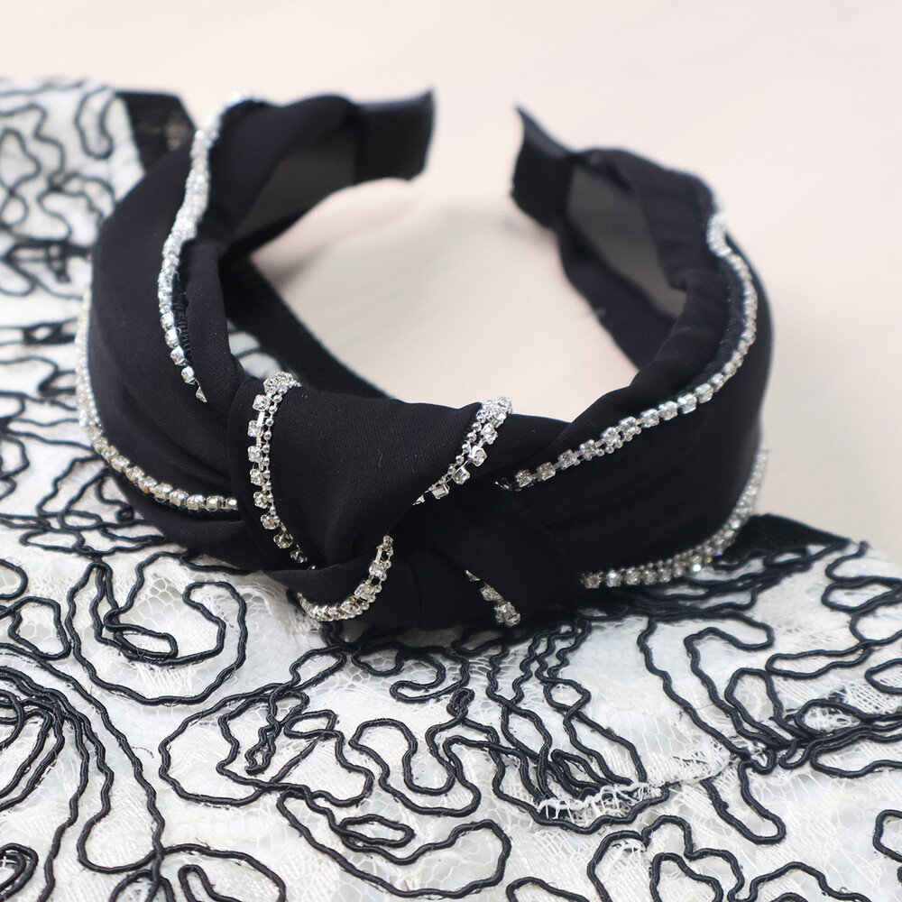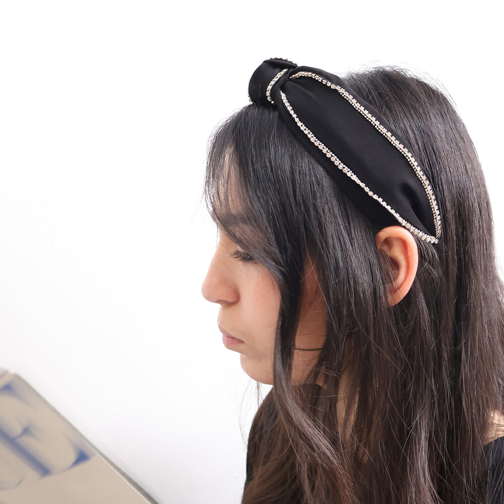 은은하게 반짝이는 블랙 크리스탈이 장식된 헤어밴드입니다.