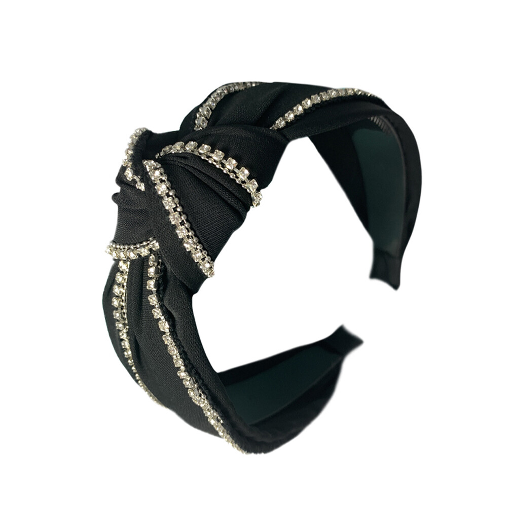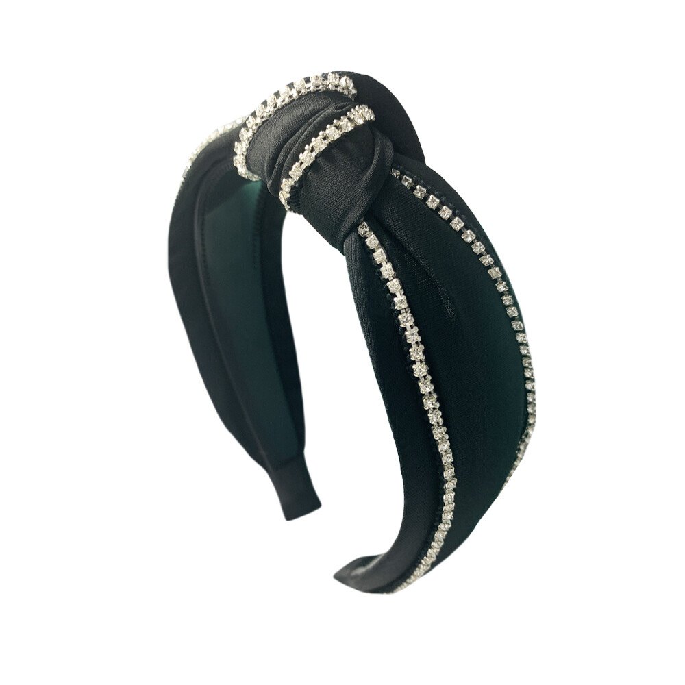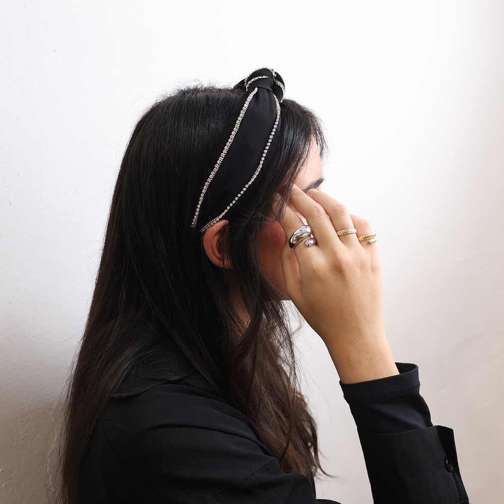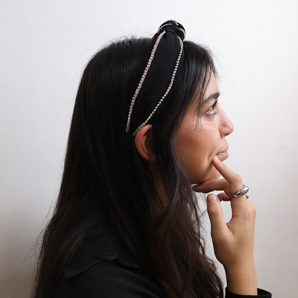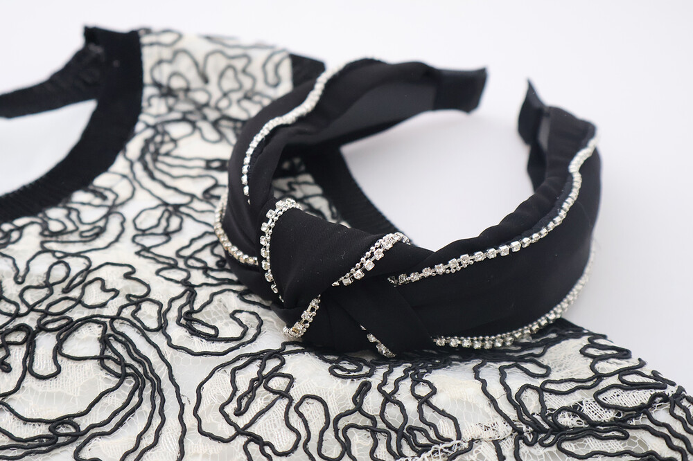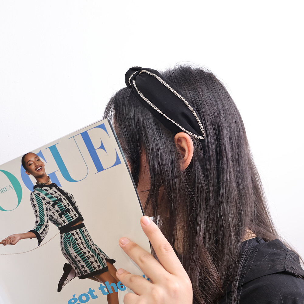 은은하게 반짝이는 블랙 크리스탈이 장식된 헤어밴드입니다.