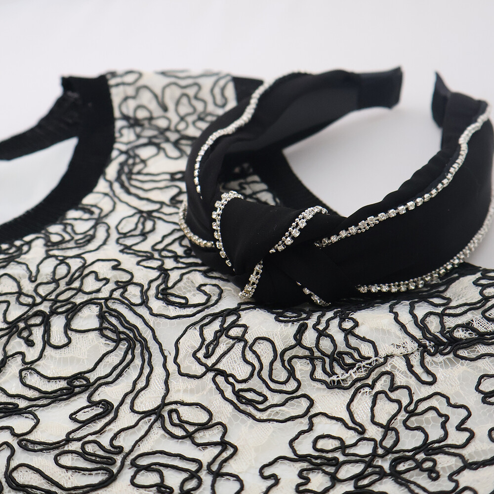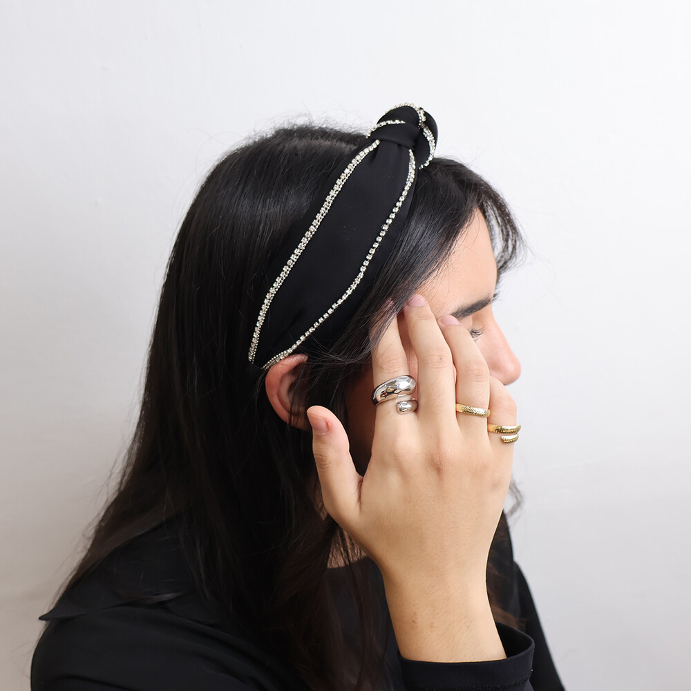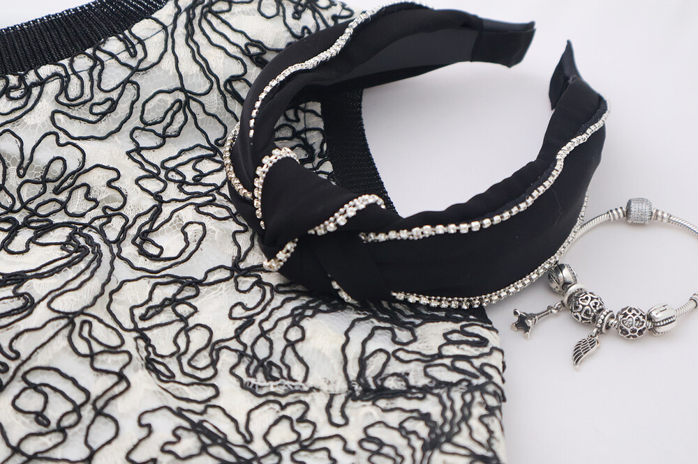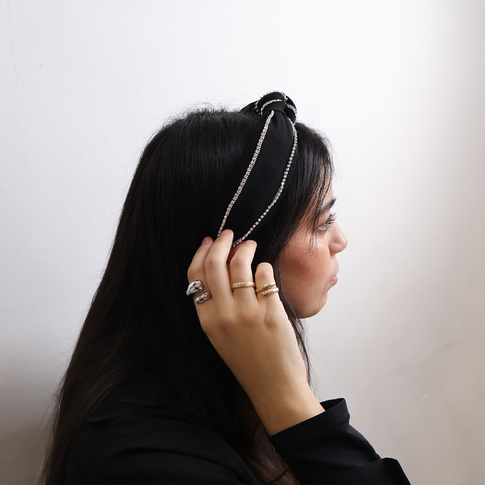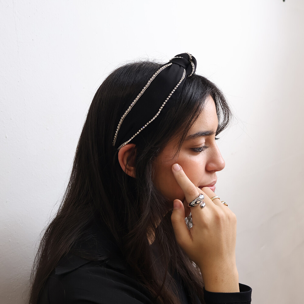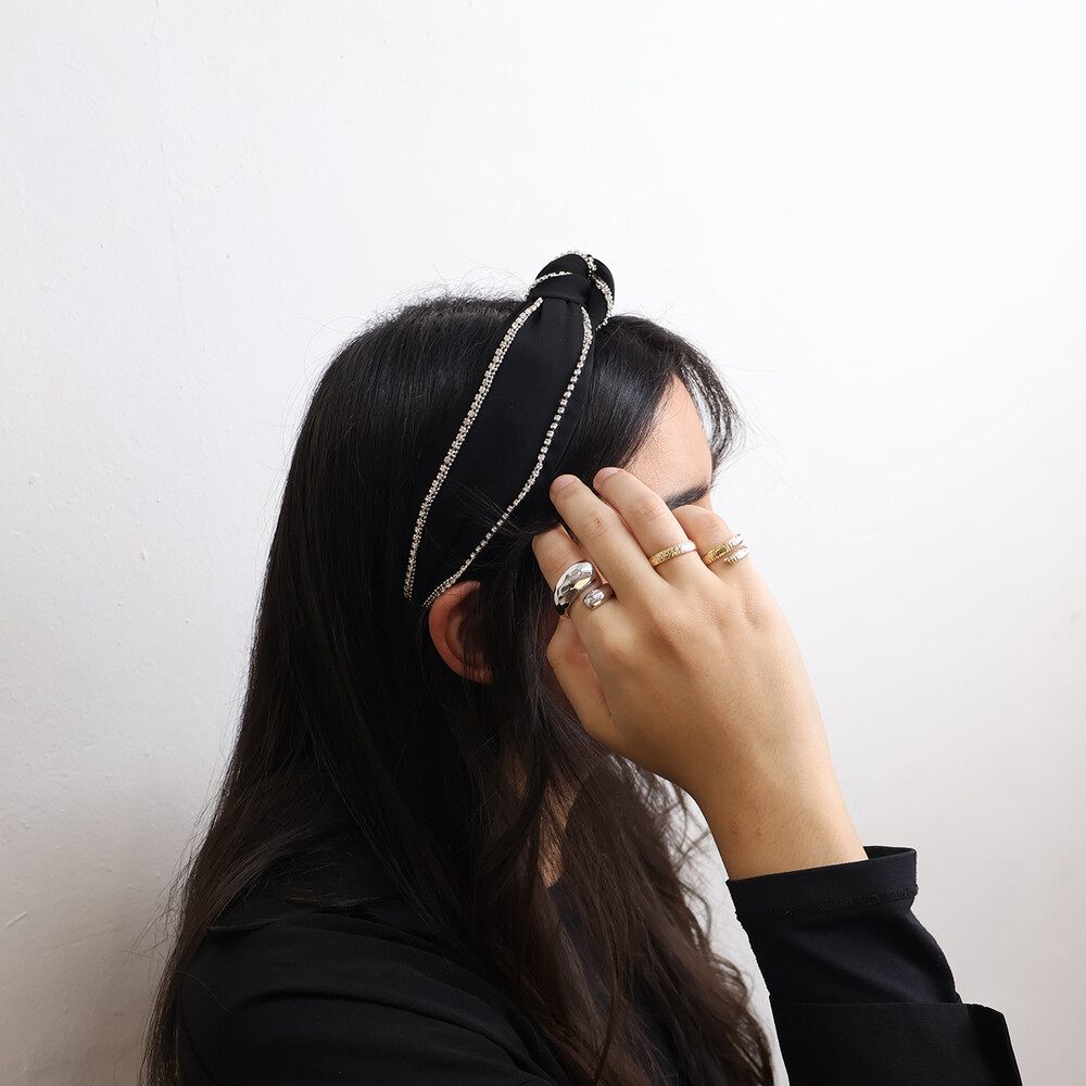 은은하게 반짝이는 블랙 크리스탈이 장식된 헤어밴드입니다.
