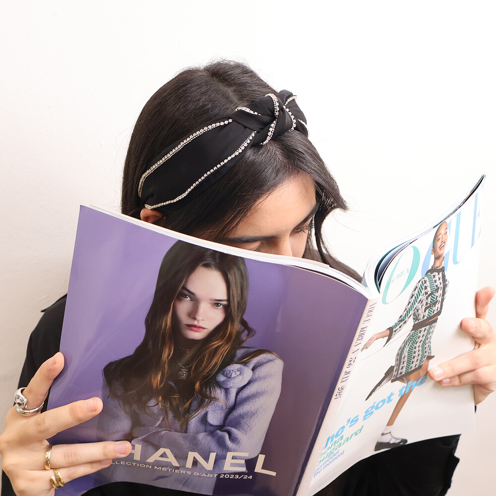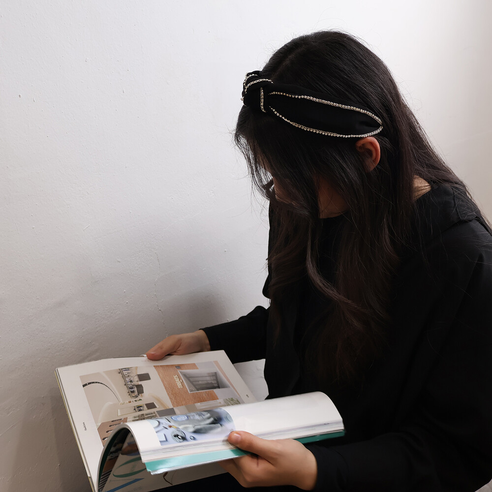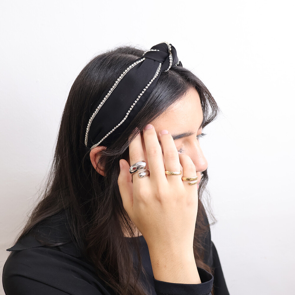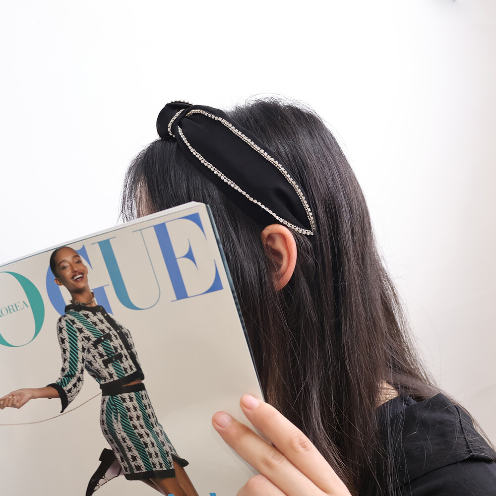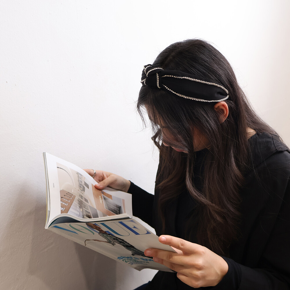은은하게 반짝이는 블랙 크리스탈이 장식된 헤어밴드입니다.