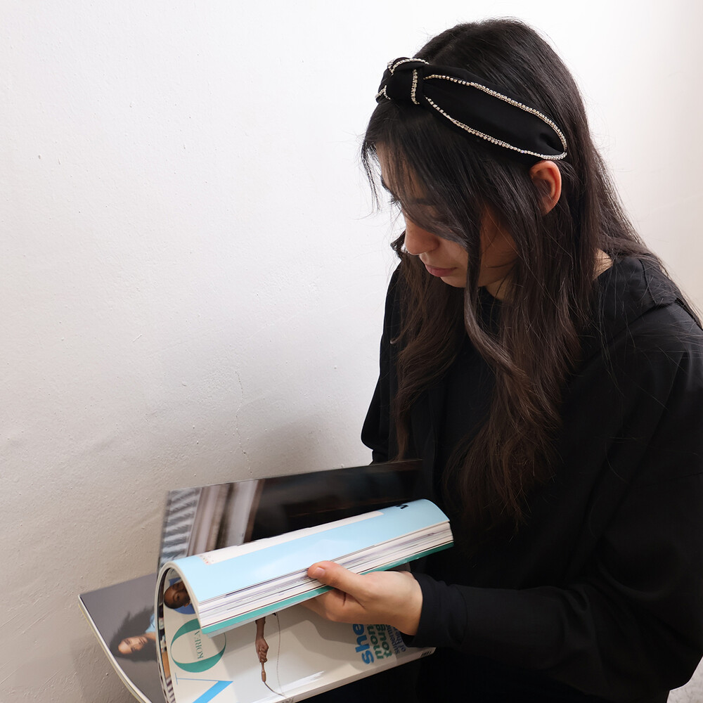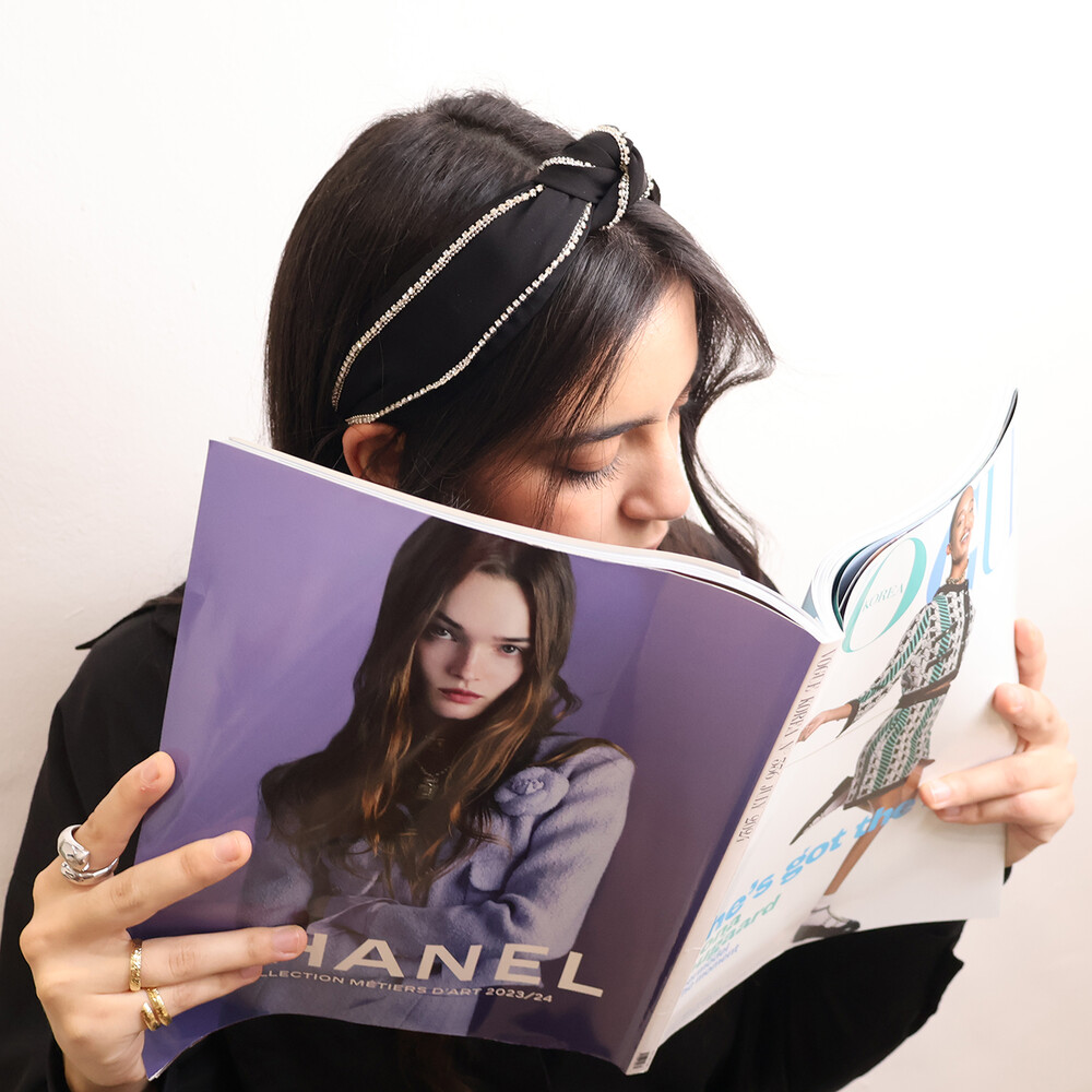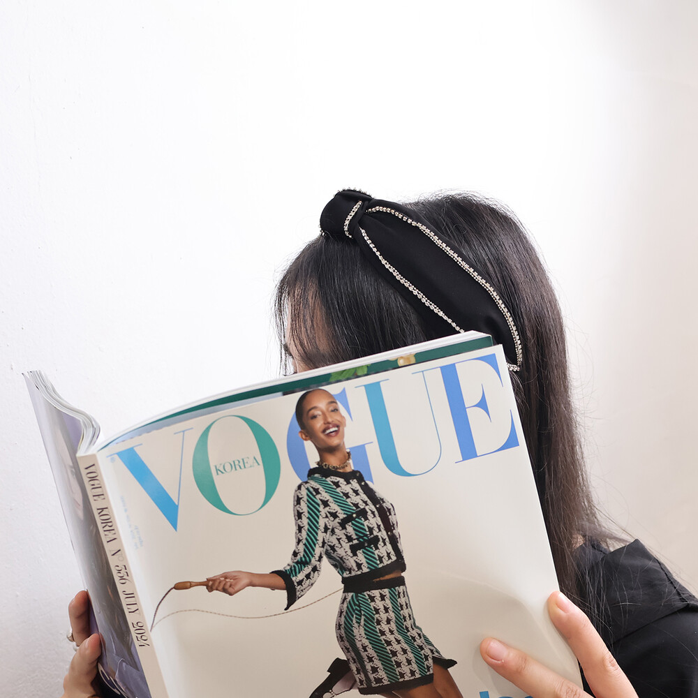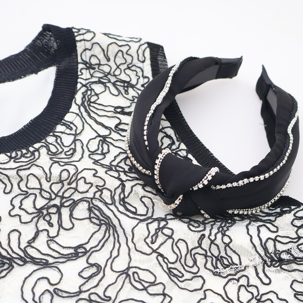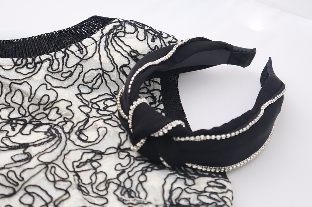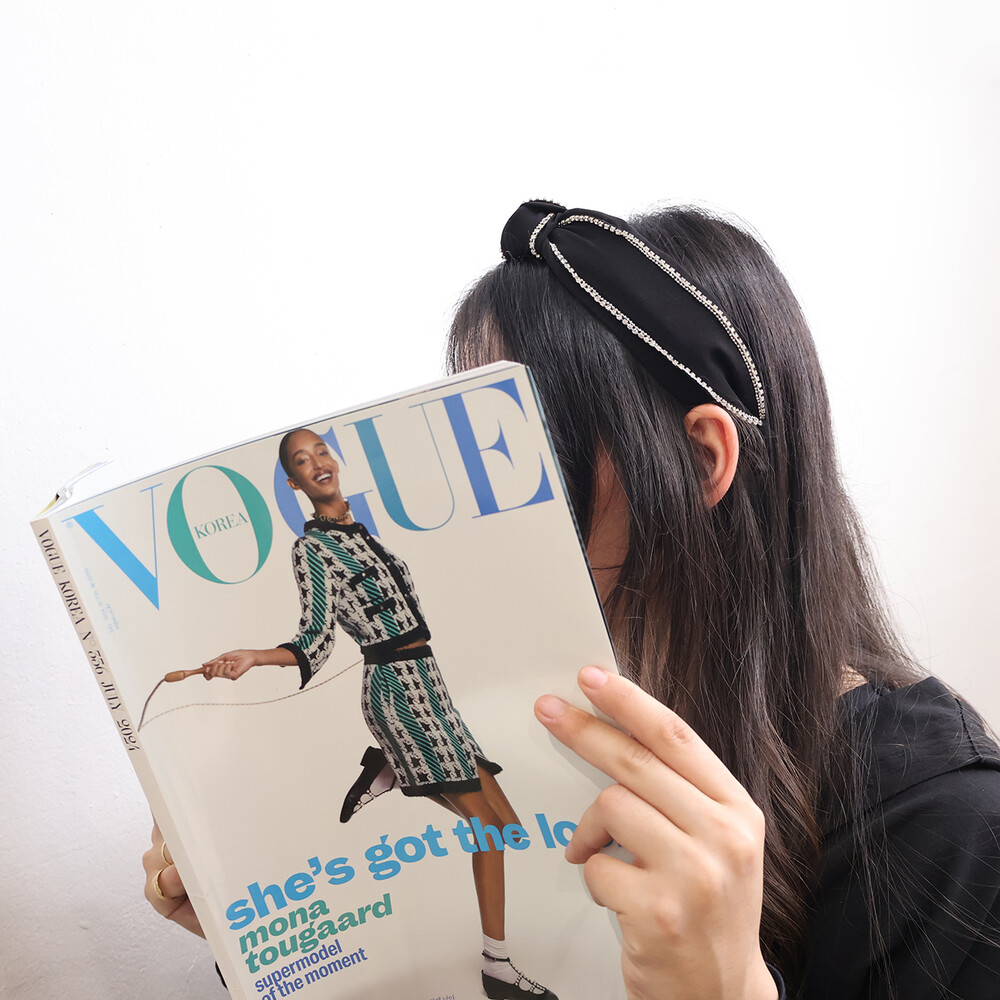 은은하게 반짝이는 블랙 크리스탈이 장식된 헤어밴드입니다.