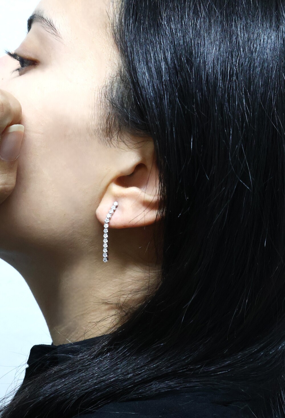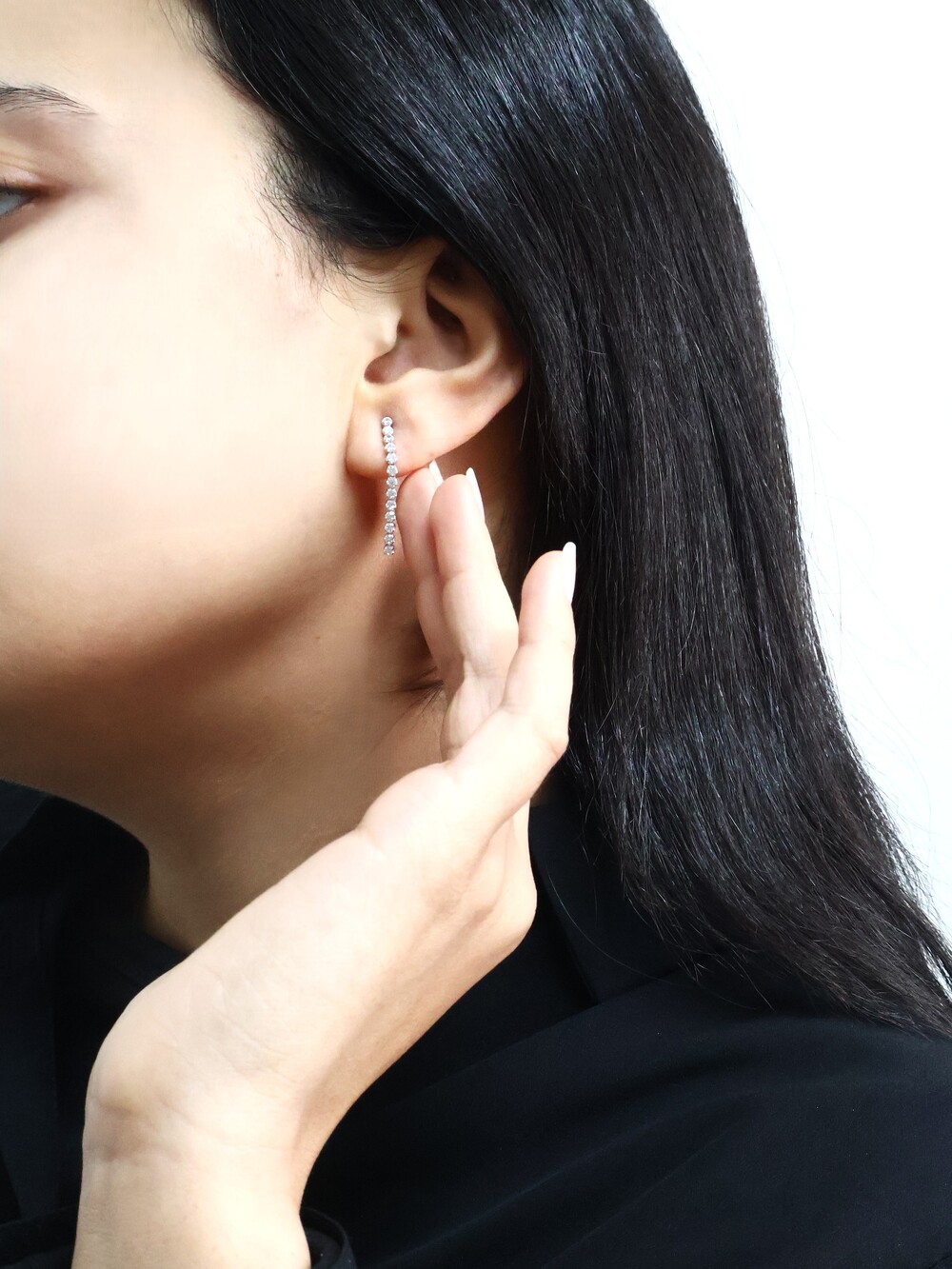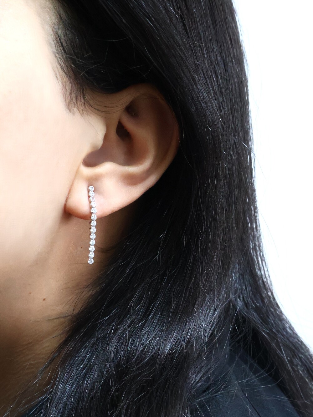 작은 젬스톤들이 한 줄로 촘촘히 세팅되어 은은한 반짝임이 돋보이는 귀걸이입니다.