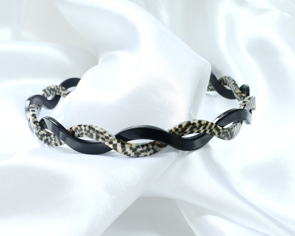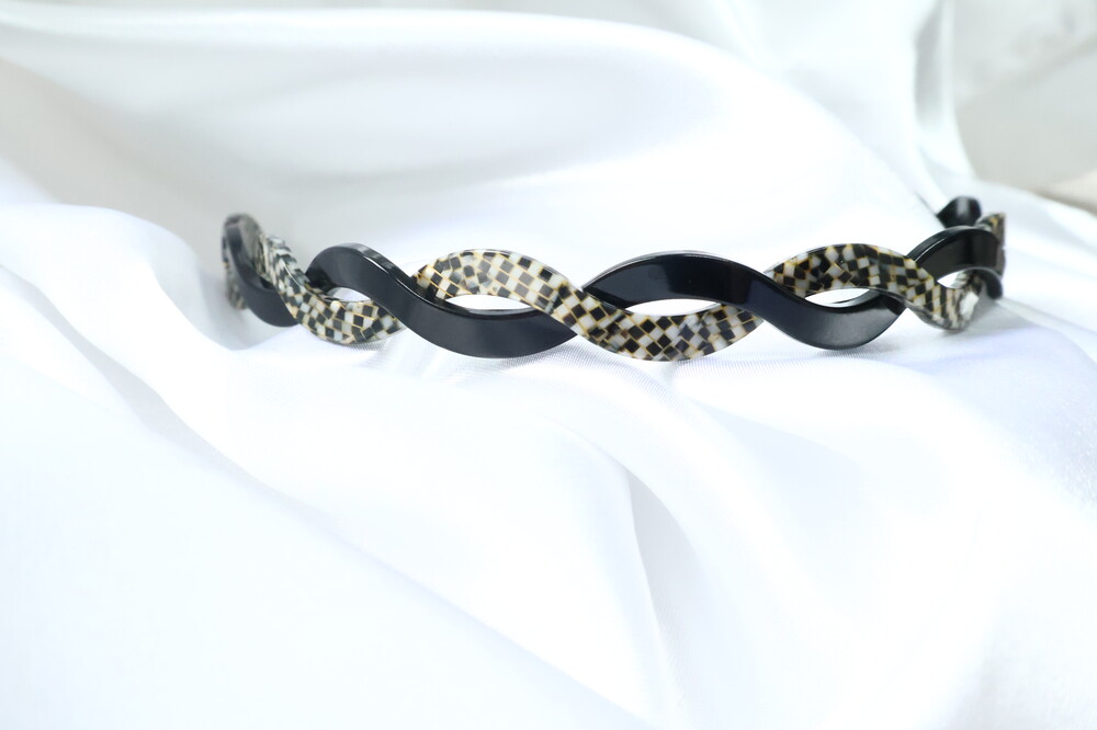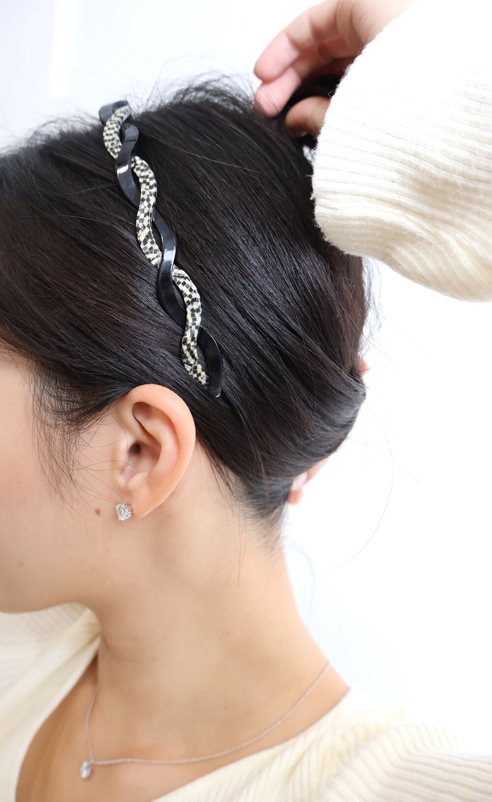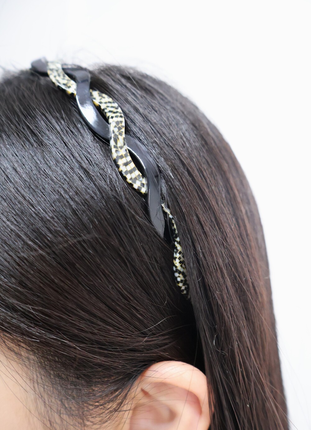 모자이크 패턴이 엮인 듯한 브레이드 디자인의 헤어밴드입니다.