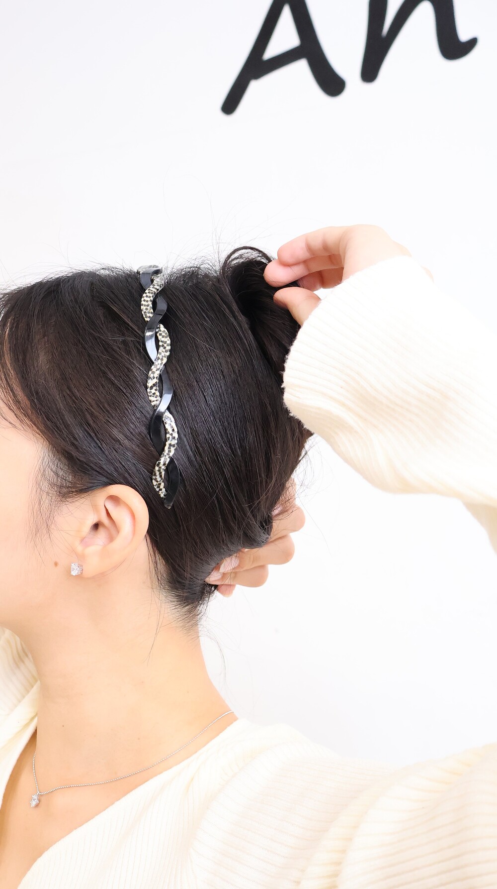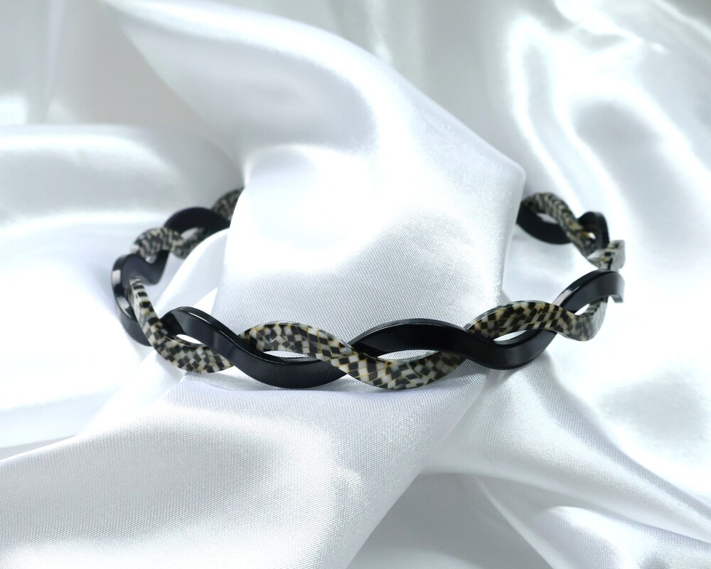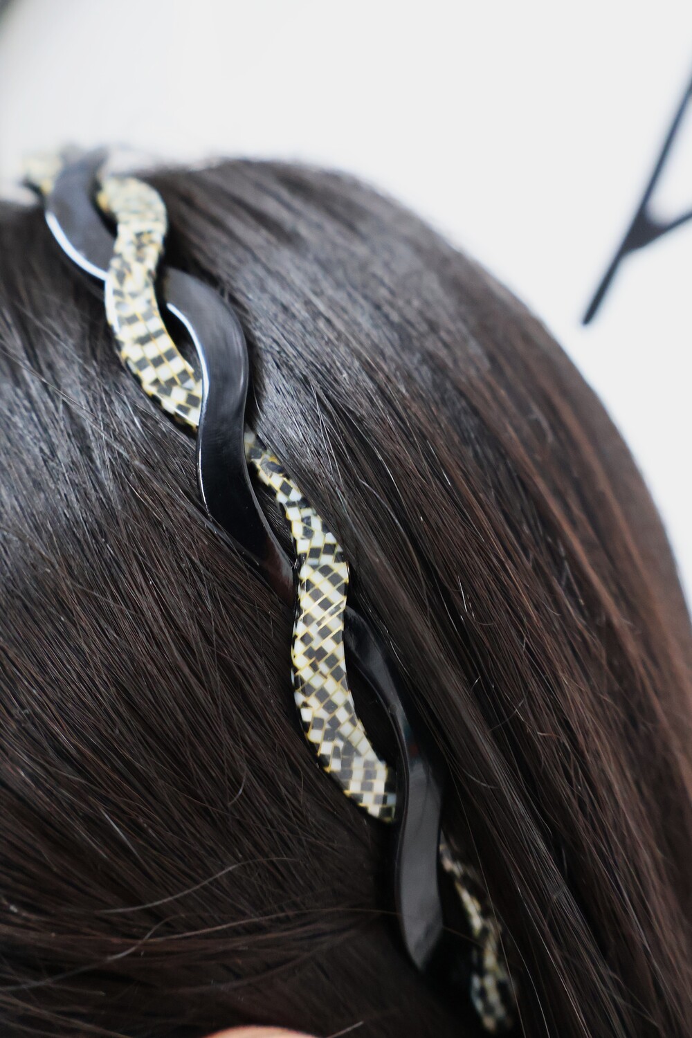 모자이크 패턴이 엮인 듯한 브레이드 디자인의 헤어밴드입니다.