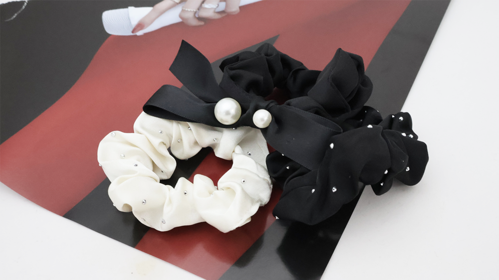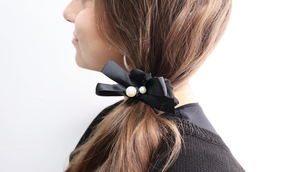 우아하고 고급스러운 느낌을 주는 진주는 리본과 함께 사용될 때, 더욱 여성스럽고 세련된 분위기를 연출합니다.