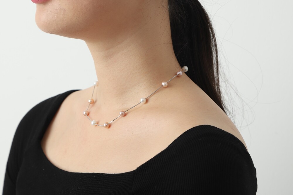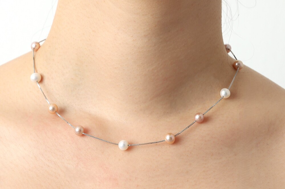 깎거나 가공하지 않은 화이트, 피치, 모브 톤의 멀티 컬러 진주가 고급스럽게 조화된 진주 목걸이입니다.