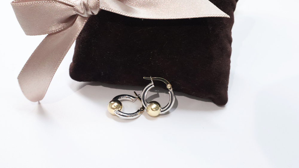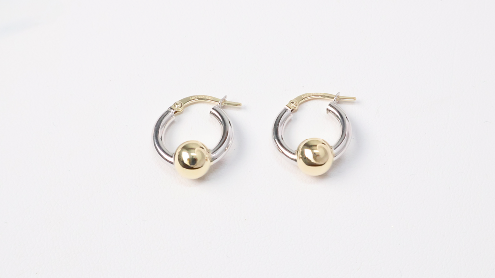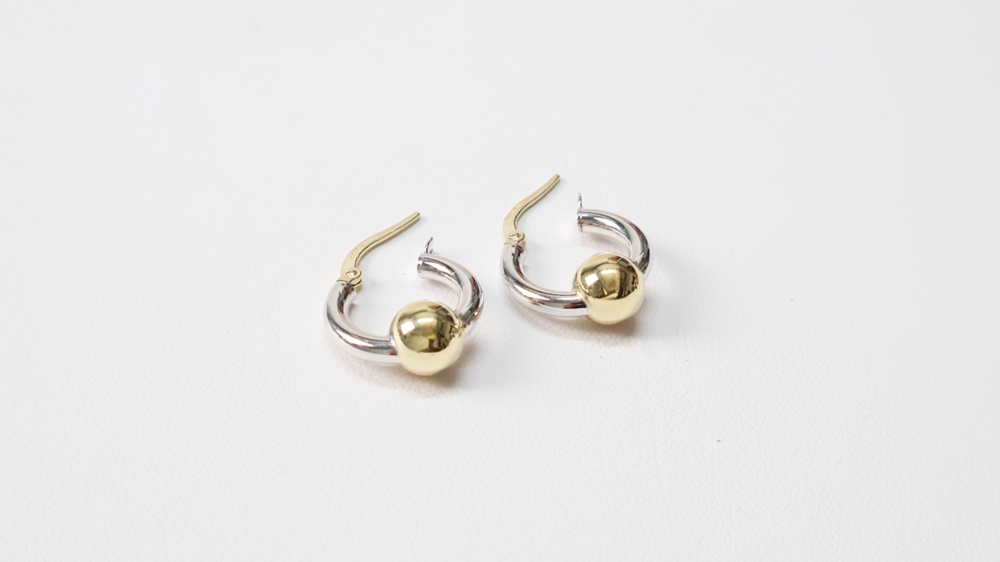 실버 튜브 형태의 프레임에 골드 비즈를 중앙 포인트로 더한 귀걸이로,