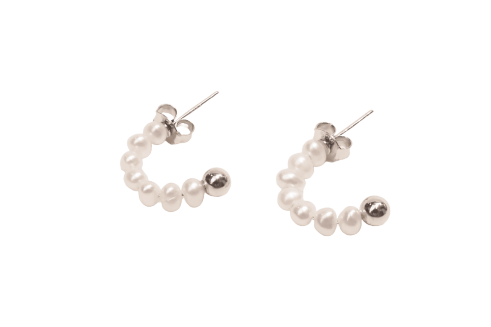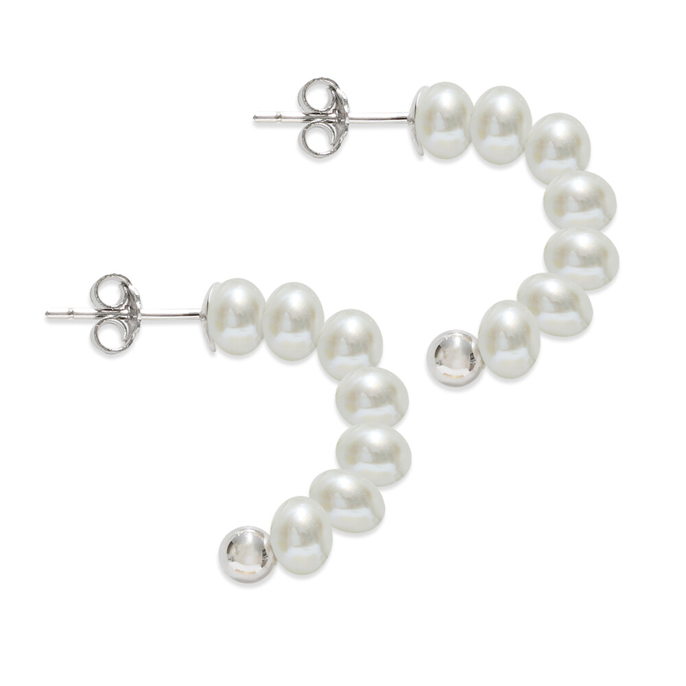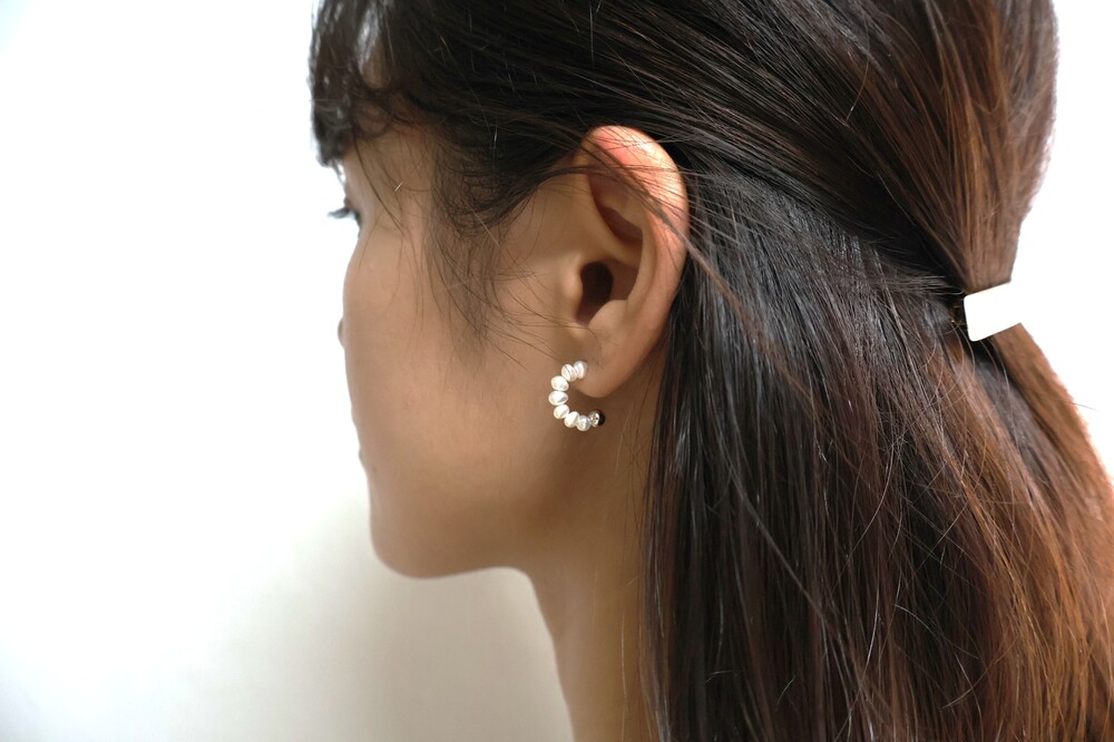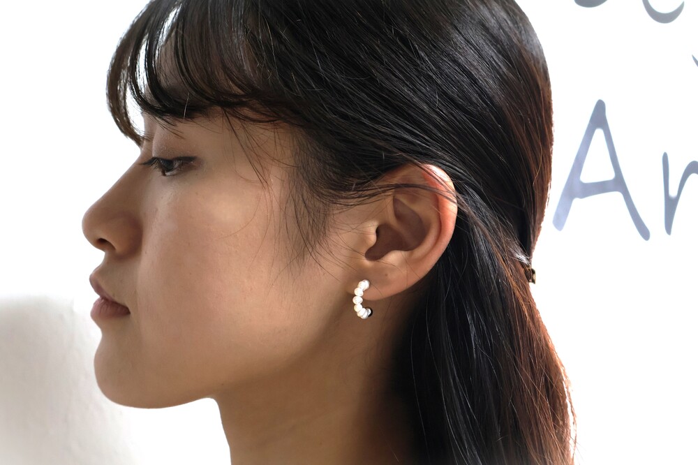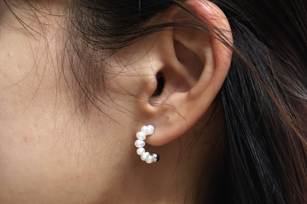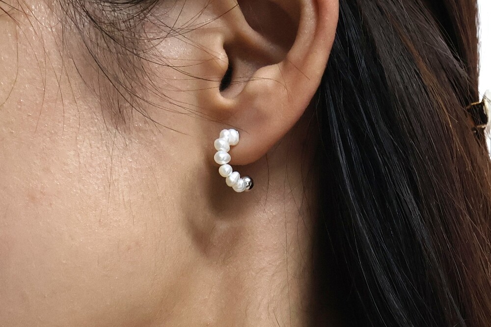 커브 라인 형태로 작고 귀여운 진주가 배열된 디자인의 귀걸이입니다.