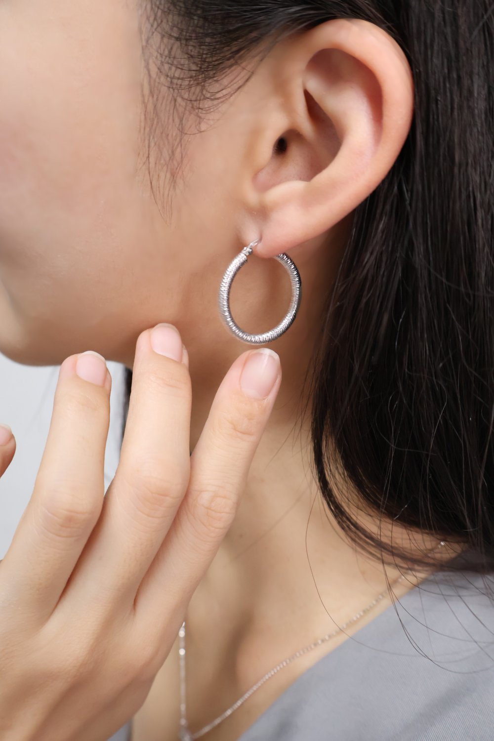 고급 실버 소재로 제작된 라운드형 귀걸이로, 표면에 다이아 컷팅 가공을 더해 섬세한 반짝임과 입체적인 광택을 연출합니다. 둥글고 부드러운 실루엣이 얼굴에 자연스럽게 어우러지며, 클래식하면서도 세련된 분위기를 자아냅니다.