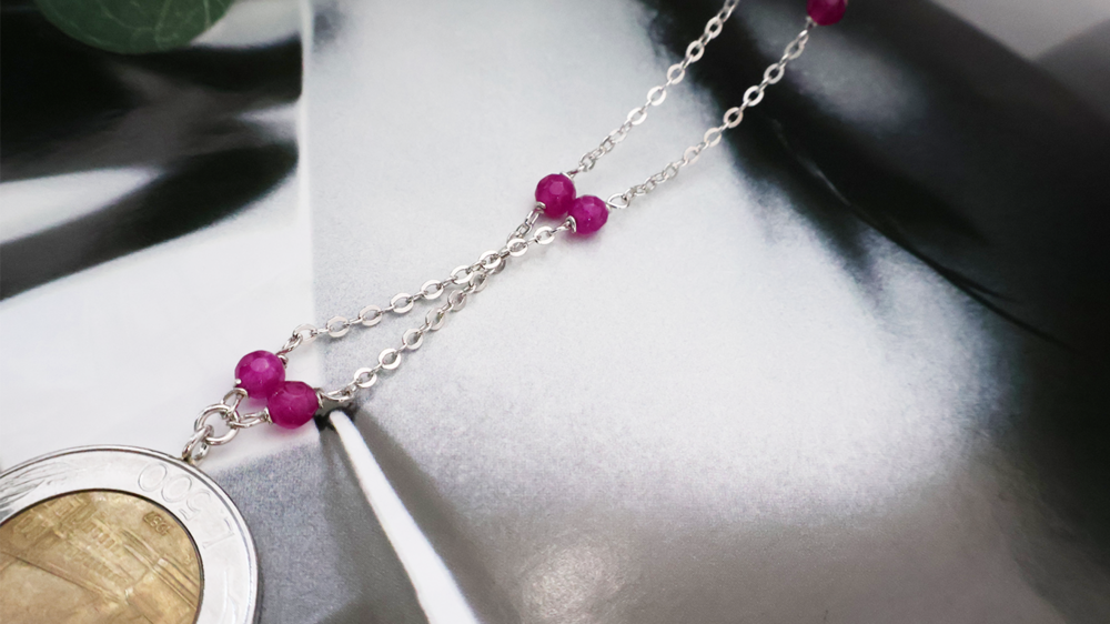 보라색 루비 쿼츠 원석이 포인트로 사용된 세련된 목걸이입니다.