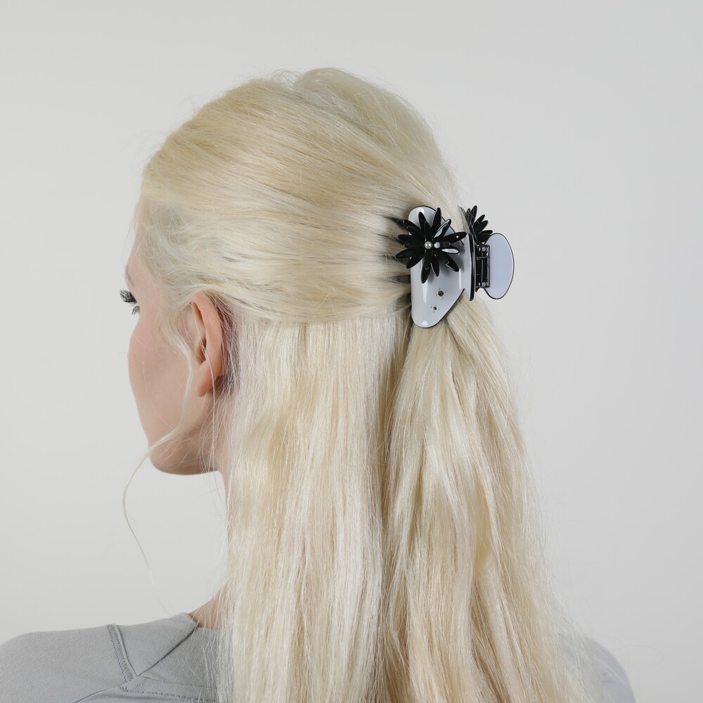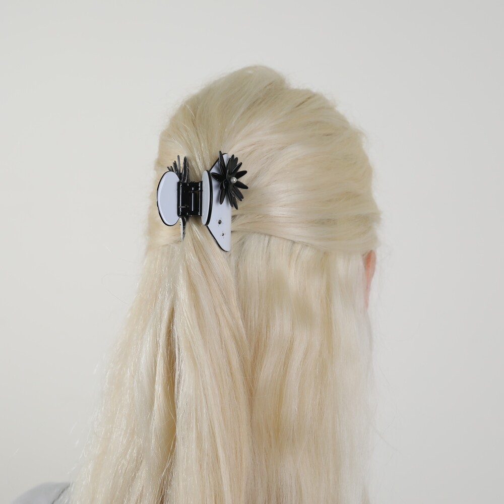 블랙 플라워 집게핀은 시크하면서도 우아한 분위기를 연출해주는 플라워 디자인의 헤어 집게핀입니다.