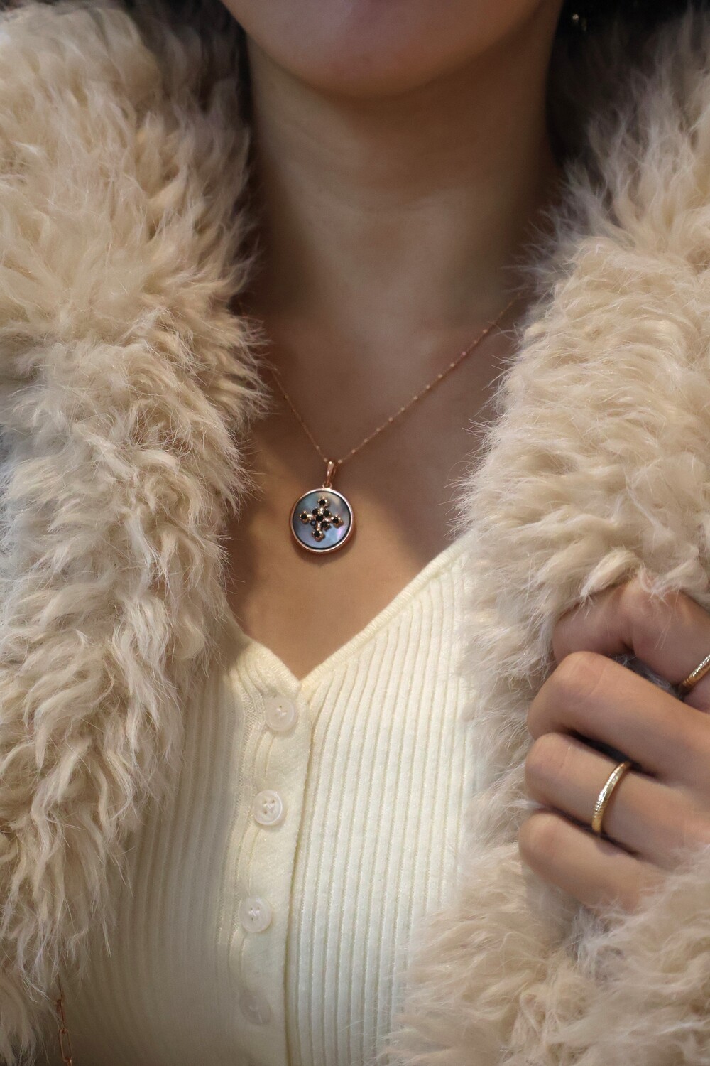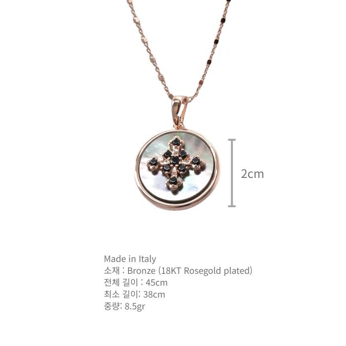 또한 마더오브펄(자개)이 빛을 받을 때마다 영롱하게 반사되어 신비로운 느낌을 주는 목걸이에요.