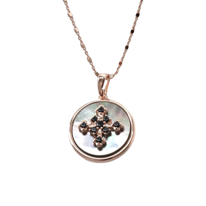 오닉스 누아르 목걸이는 블랙 오닉스 큐빅이 십자가 형태로 세팅되어 깊이 있는 무드를 완성합니다.